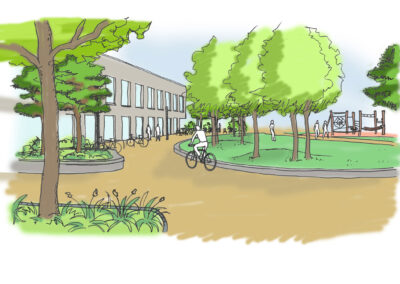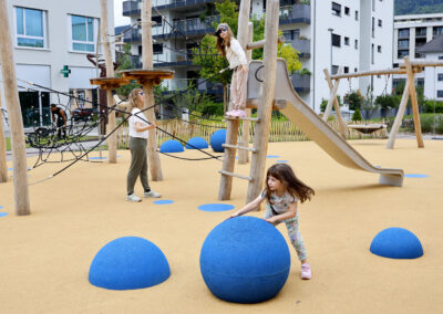 Le projet de réaménagement du parc Pré-Guillaume a été le déclencheur d’une intervention globale sur la dalle du parking souterrain, rendant nécessaire la reprise complète de son étanchéité. Cette contrainte technique a permis de repenser entièrement le parc et d’intégrer des solutions adaptées aux conditions de toiture, telles que des réserves d’eau et des dispositifs favorisant la croissance des arbres. Le nouveau parc offre aujourd’hui un visage rafraîchi, plus accueillant et durable, avec une place de jeux inclusive et des espaces propices à la détente..