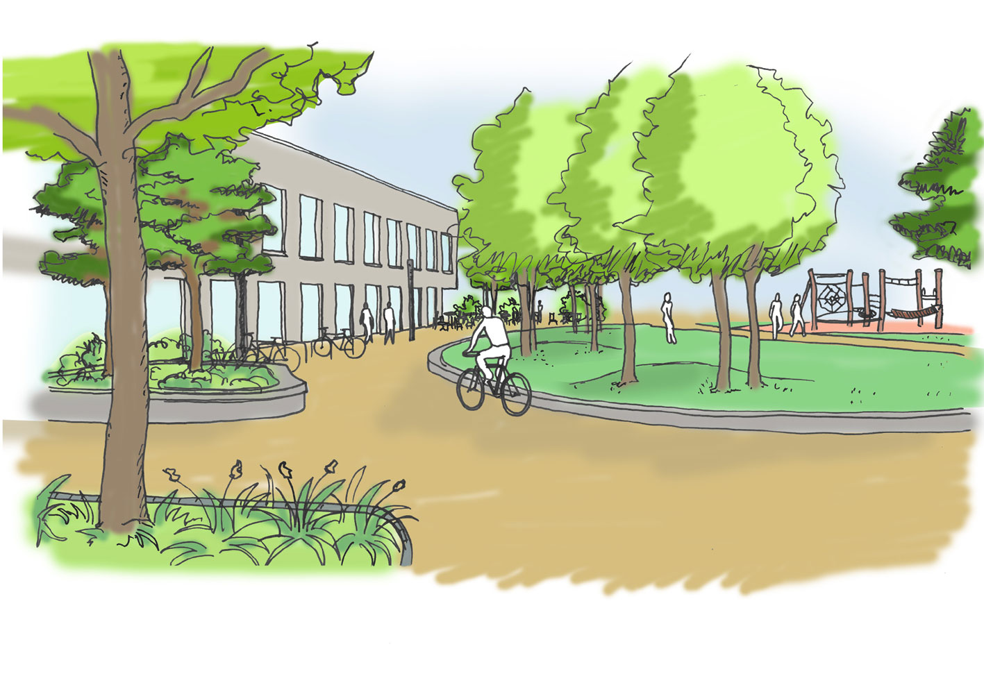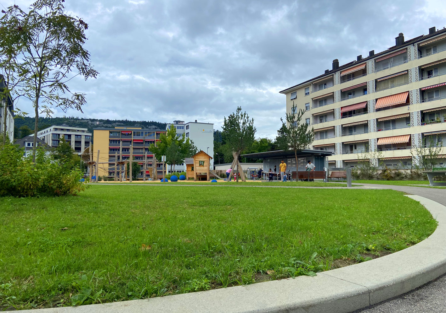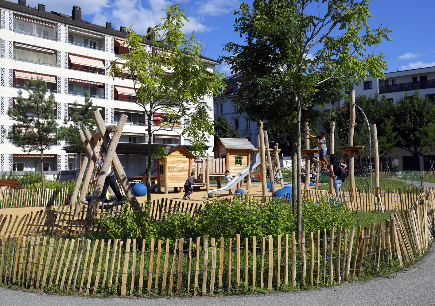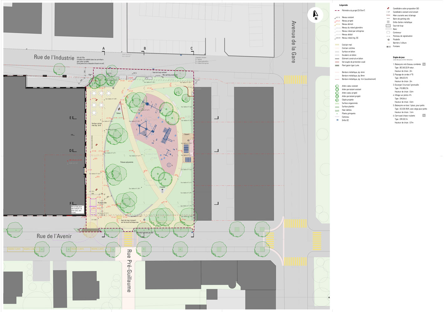 Le projet de réaménagement du parc Pré-Guillaume a été le déclencheur d’une intervention globale sur la dalle du parking souterrain, rendant nécessaire la reprise complète de son étanchéité. Cette contrainte technique a permis de repenser entièrement le parc et d’intégrer des solutions adaptées aux conditions de toiture, telles que des réserves d’eau et des dispositifs favorisant la croissance des arbres. Le nouveau parc offre aujourd’hui un visage rafraîchi, plus accueillant et durable, avec une place de jeux inclusive et des espaces propices à la détente..